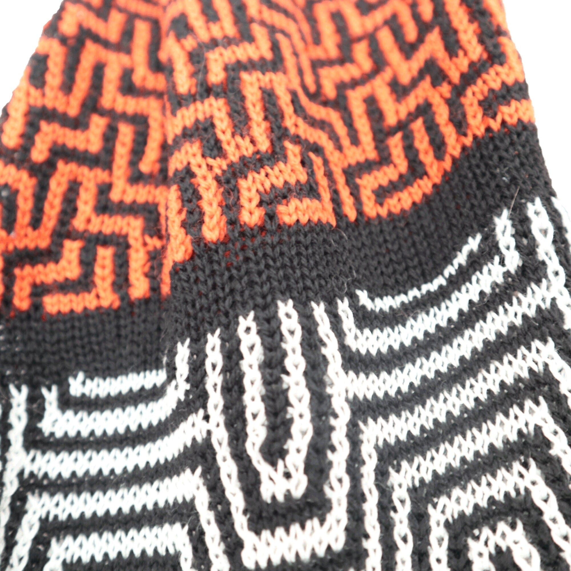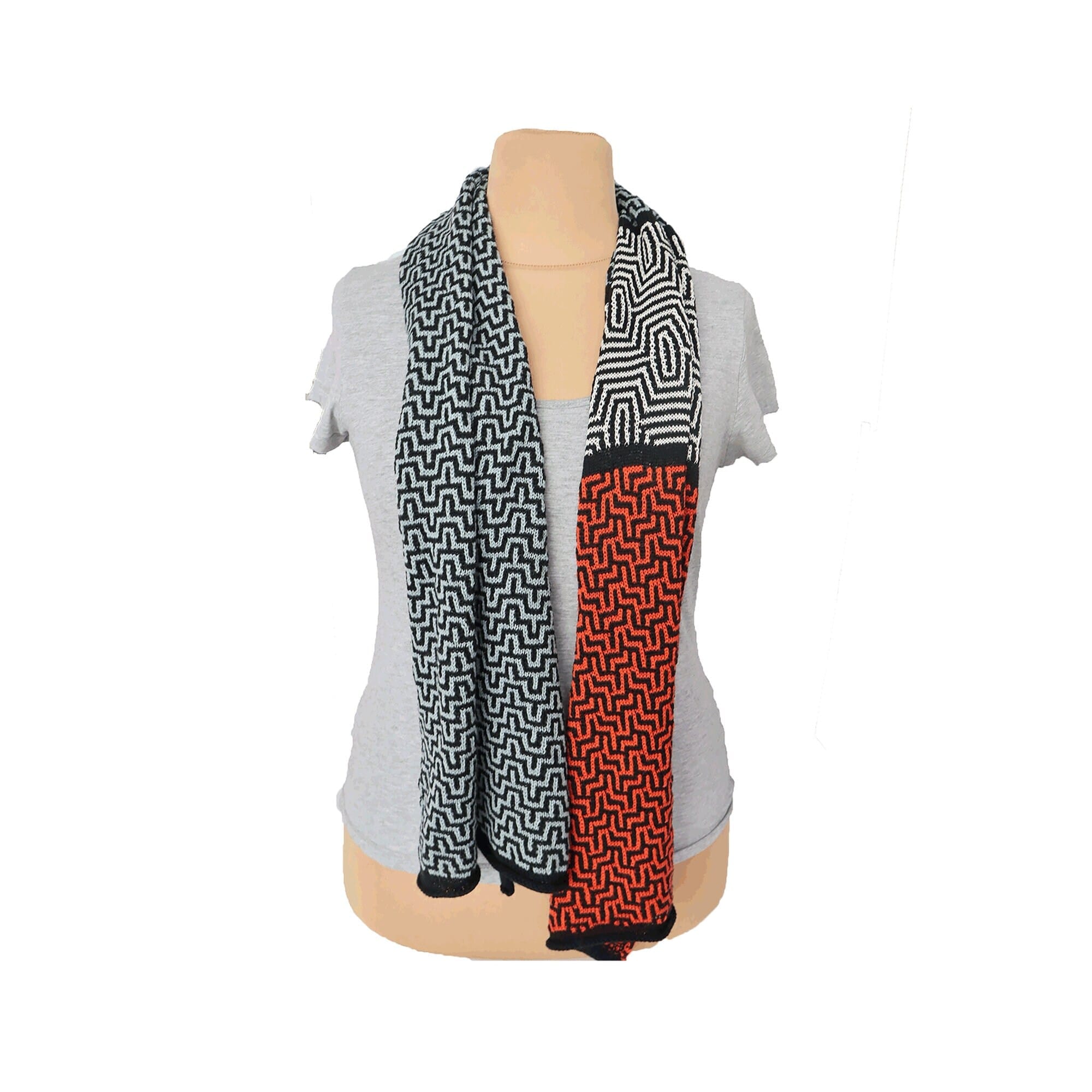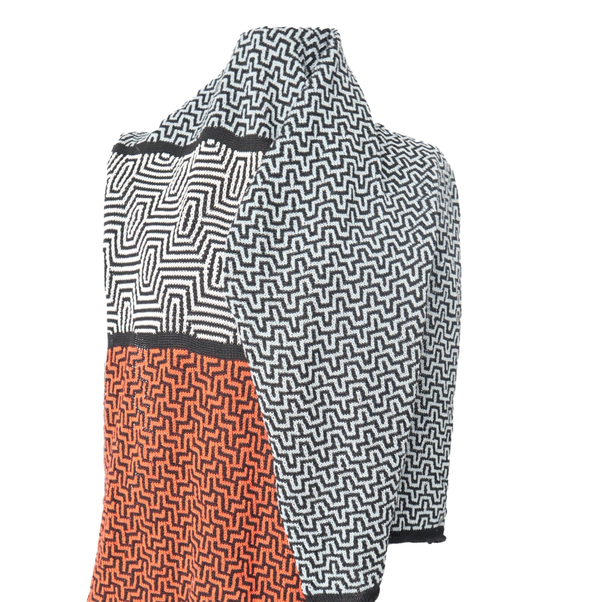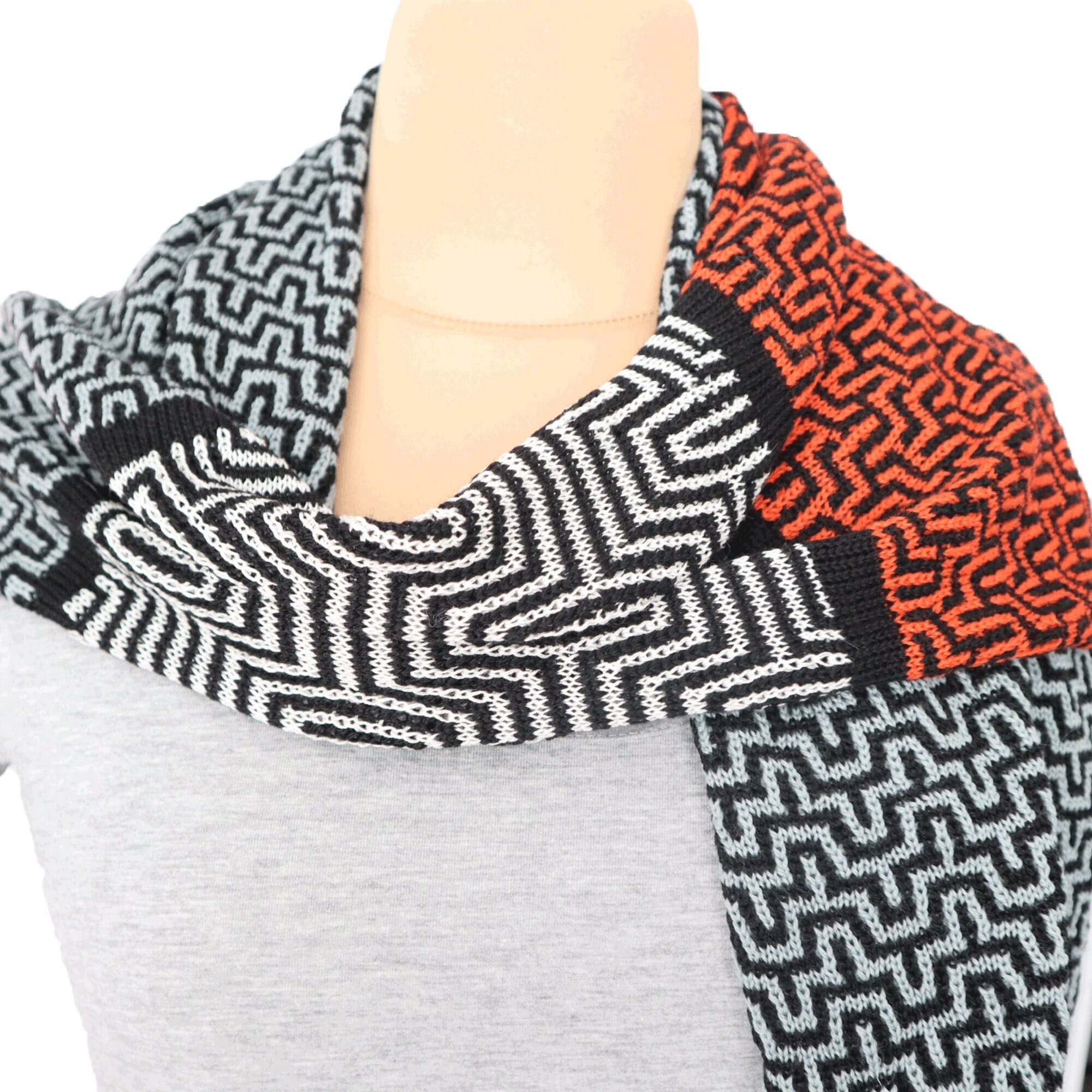 Tauchen Sie ein in die Welt luxuriöser Handwerkskunst mit diesem außergewöhnlichen Schal, der Eleganz und Komfort perfekt miteinander vereint. Hergestellt aus 100 % feinster Merinowolle, vereint er zeitlose Farben mit einem auffälligen Design, das jedes Outfit aufwertet. Der Schal wurde mit viel Sorgfalt und Präzision auf einem Handstrickapparat gefertigt und überzeugt durch sein harmonisches Farbspiel aus klassischem Schwarz, elegantem Grau und einem kräftigen Orange, das für einen modernen Akzent sorgt.